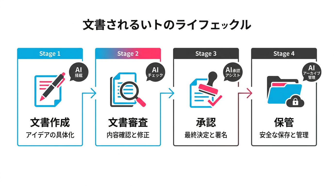 文書管理にAIを導入することで、上記の3つの問題を体系的に解決できます。ここでは「文書ライフサイクル4段階モデル」として整理します。
