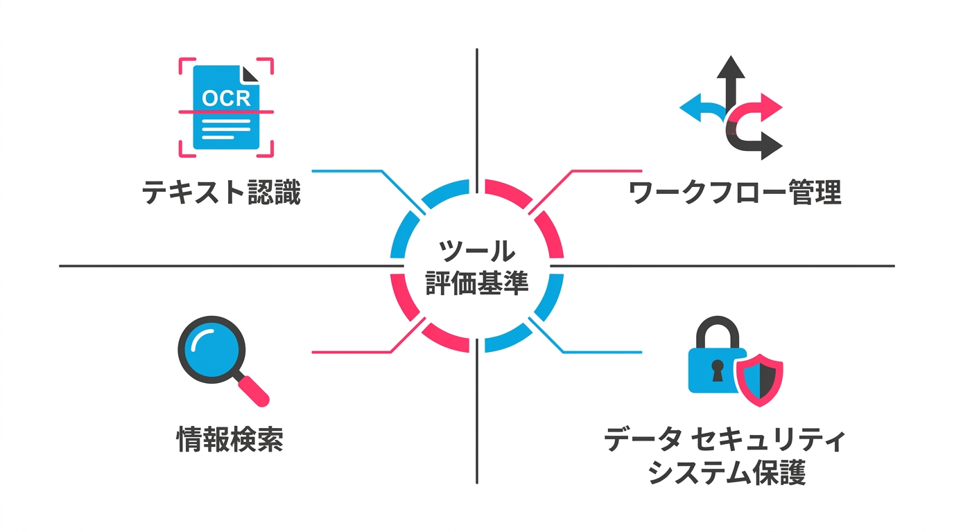 - ツール選定の4軸: AI-OCR精度、ワークフロー柔軟性、検索性能、セキュリティ