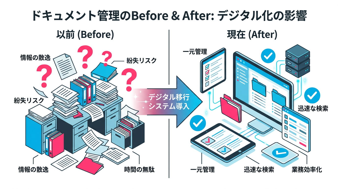 全社共通の分類体系を作り、文書の種類(契約書、稟議書、報告書、マニュアルなど)× 業務領域(営業、法務、経理など)のマトリクスで整理するのが効果的です。この設計は、DXでレビュープロセスを変革する方法でも触れているように、デジタル化の土台になります。