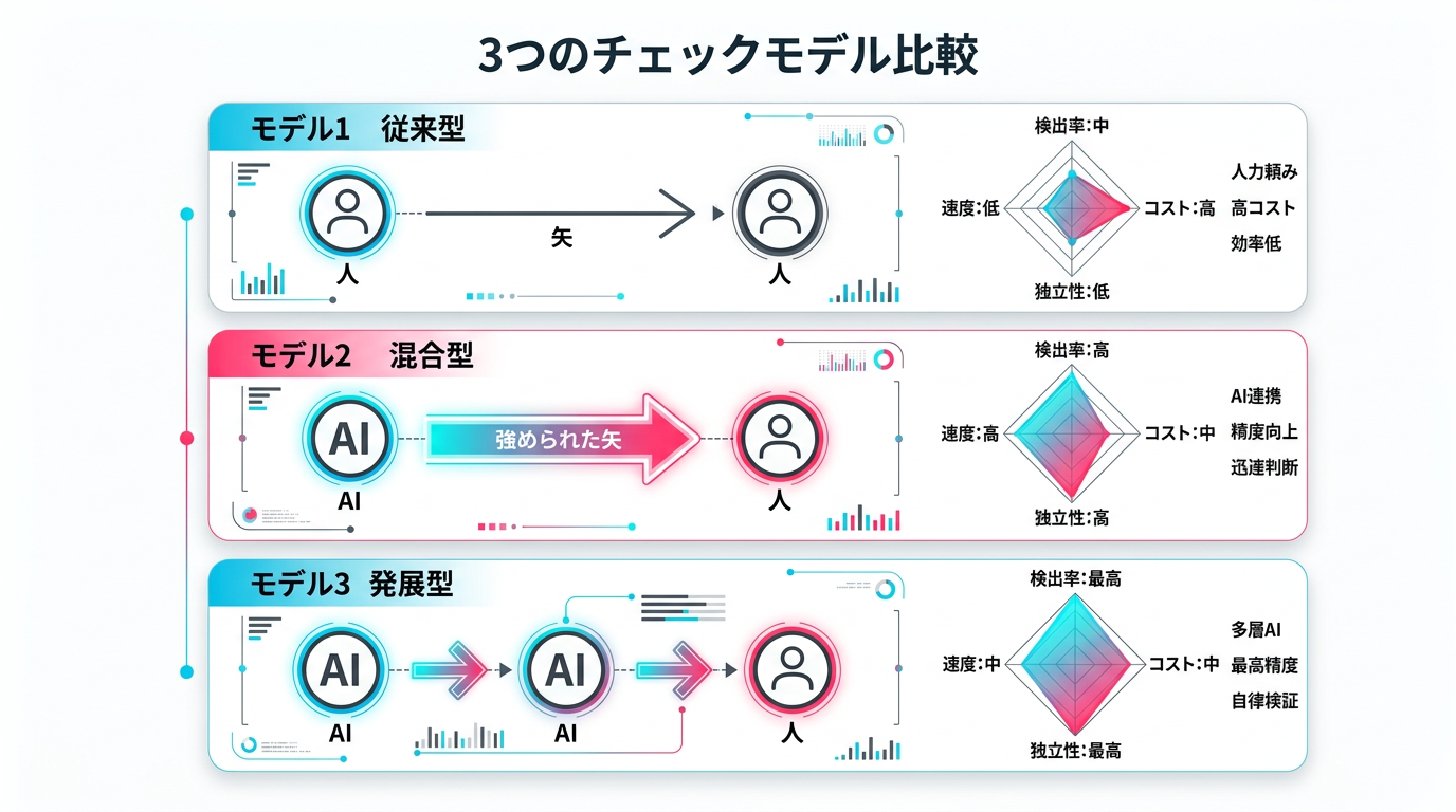ダブルチェックにAIを組み込む方法は、大きく3つのモデルに分類できます。