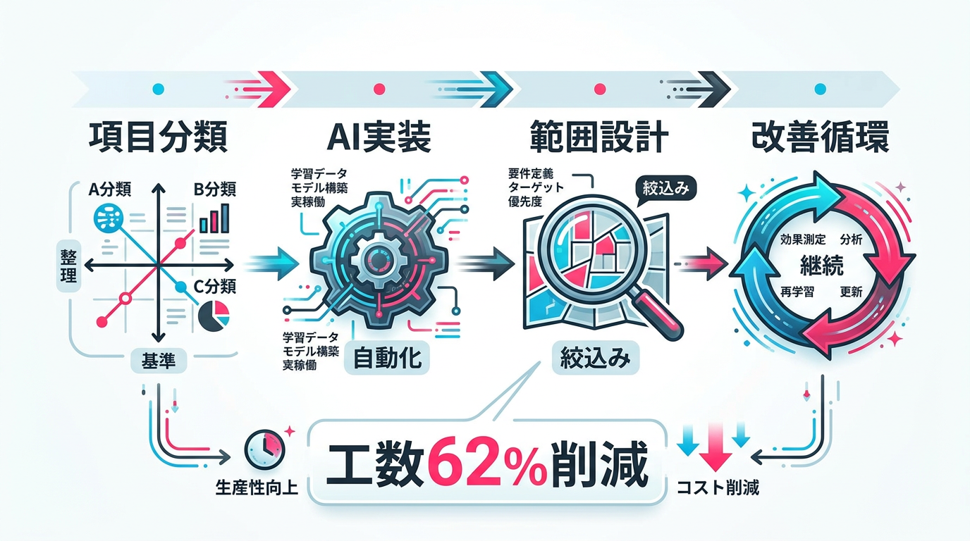 - 導入4ステップ: チェック項目のABC分類 → AI一次チェック実装 → レビュー範囲の再設計 → フィードバックループ構築