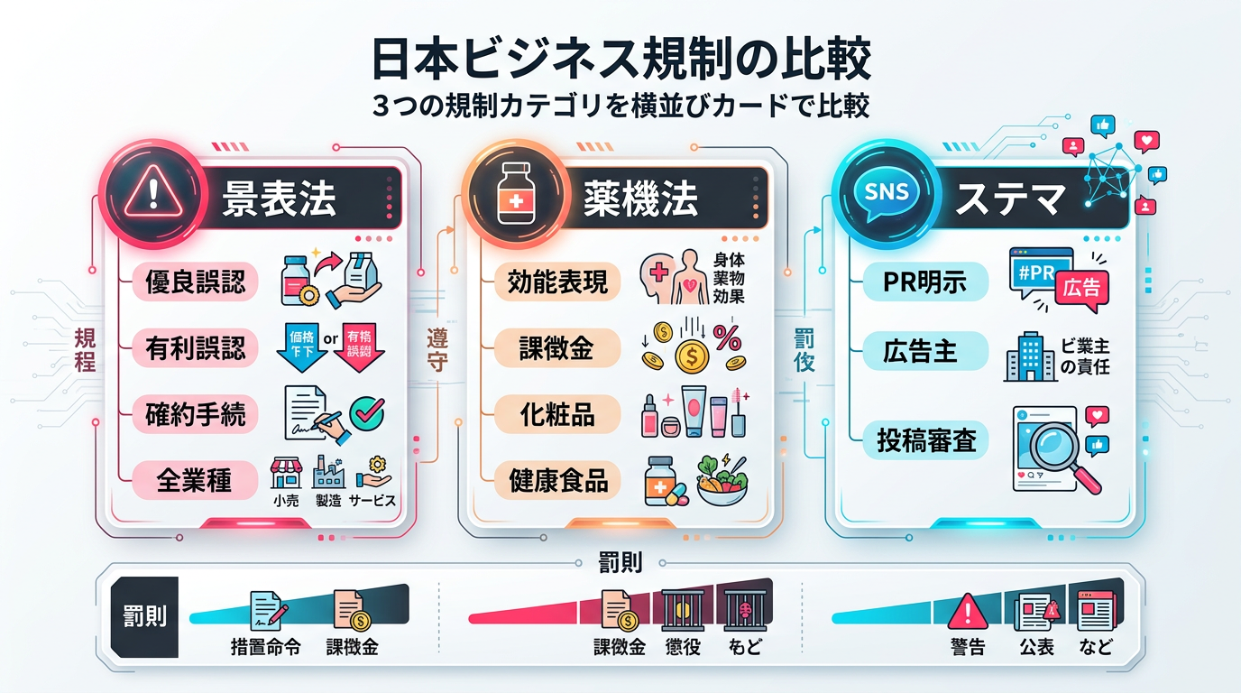 景表法(景品表示法)は全業種の広告における不当表示(優良誤認・有利誤認)を規制する法律です。薬機法(医薬品、医療機器等の品質、有効性及び安全性の確保等に関する法律)は医薬品・化粧品・健康食品の広告に特化し、効能効果の表現を厳しく制限する法律です。化粧品や健康食品の広告では両方が同時に適用されるため、両法令を横断したチェックが必要です。