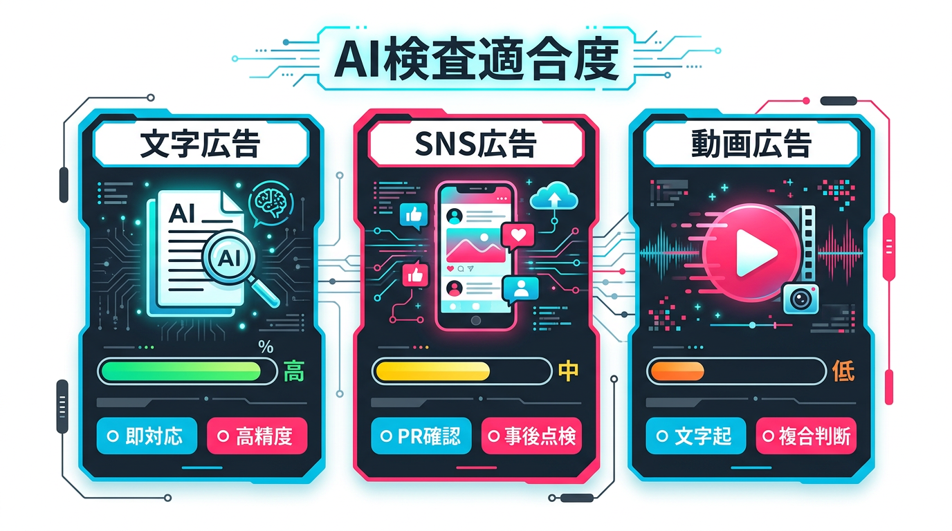 - 広告種別への対応: テキスト広告はAI相性が高く、SNS広告はステマ規制チェックが必須、動画広告はマルチモーダル対応が課題