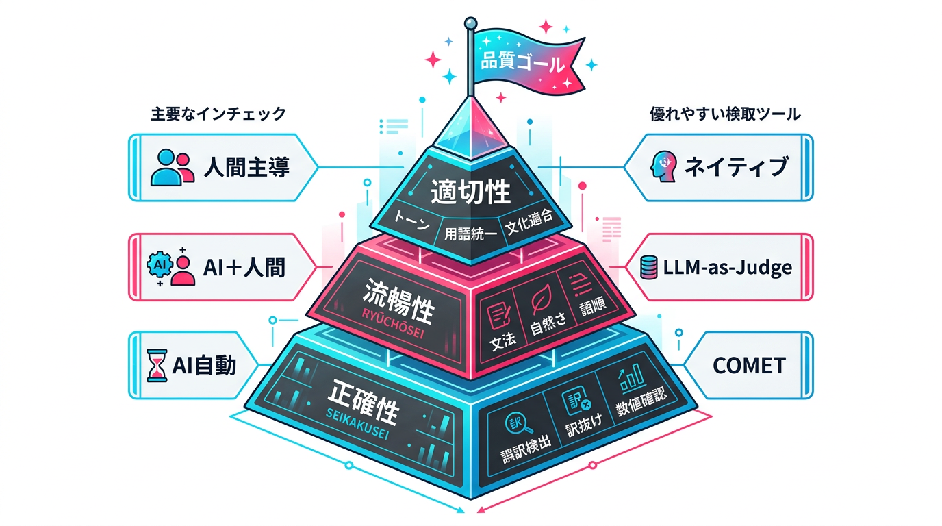 - 3階層モデルで品質基準を設計する: 正確性→流暢性→適切性の順にチェック。下の階層が満たされなければ上のチェックは無意味