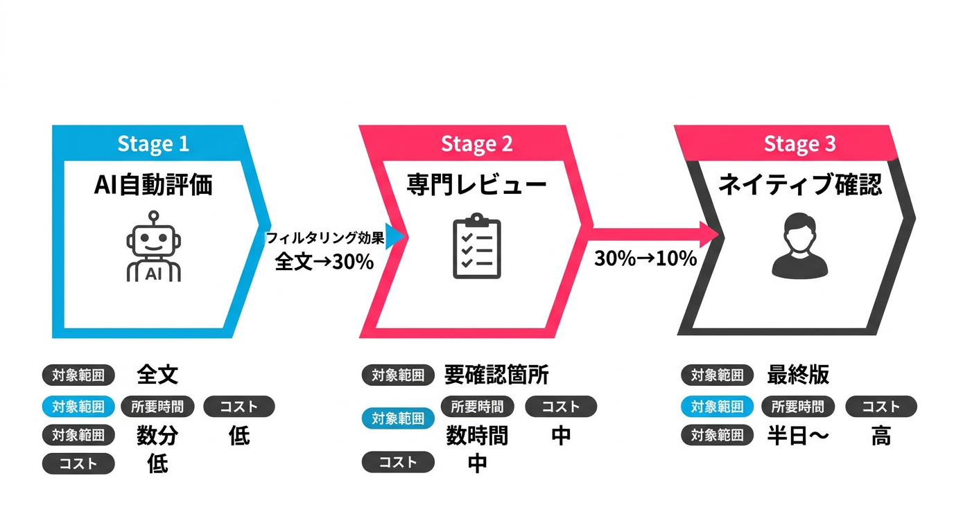 重要なのは、ネイティブレビューの範囲を事前に限定することです。AI自動評価と専門レビューを経た後のネイティブ確認は、「読んで違和感がないか」に集中できます。すべてのチェックをネイティブに任せると、コストと時間が膨れ上がるため、Stage 1と2で品質の底上げをしておくことが前提です。