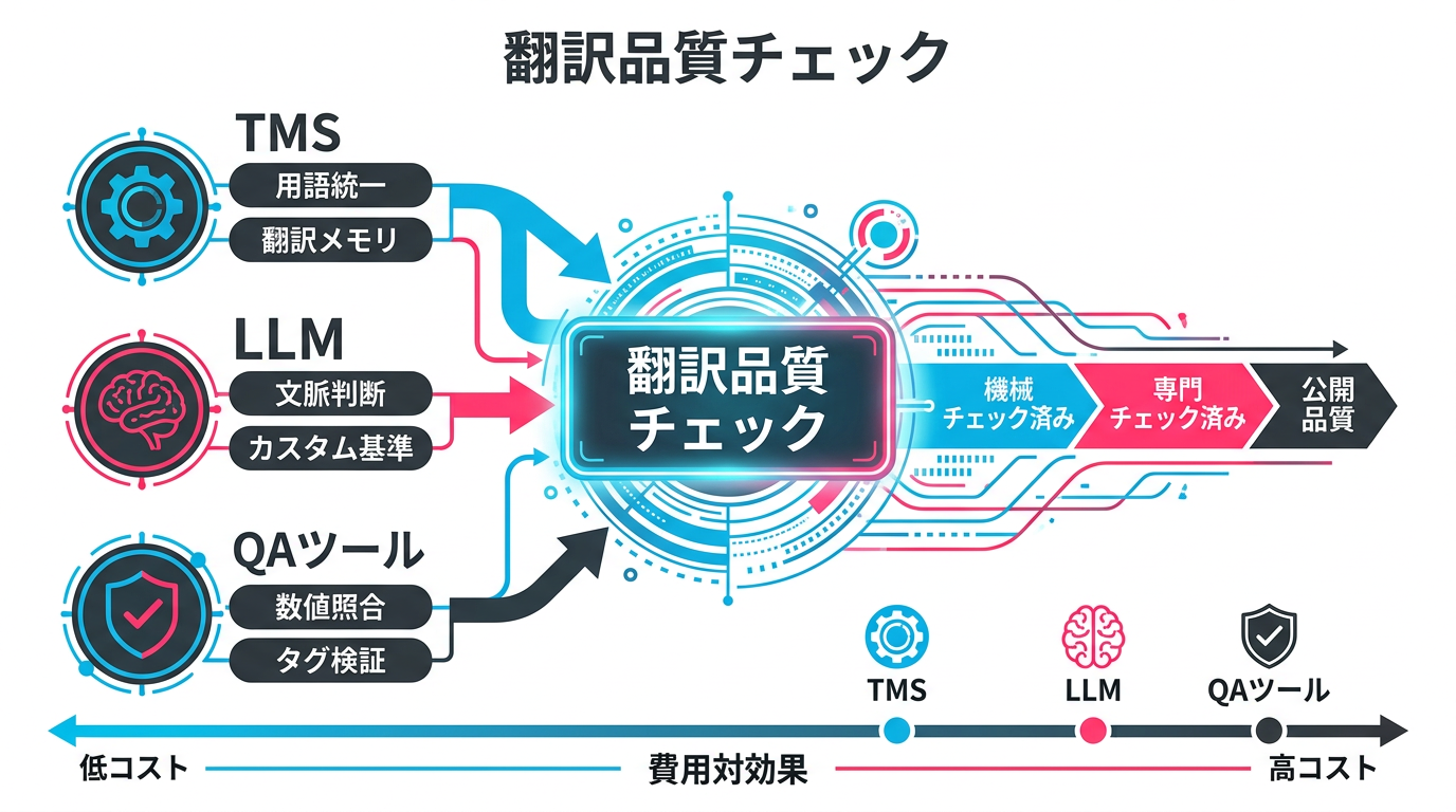 翻訳品質チェックの実務では、翻訳管理システム(TMS)、LLM、専用ツールを組み合わせて使うのが一般的です。