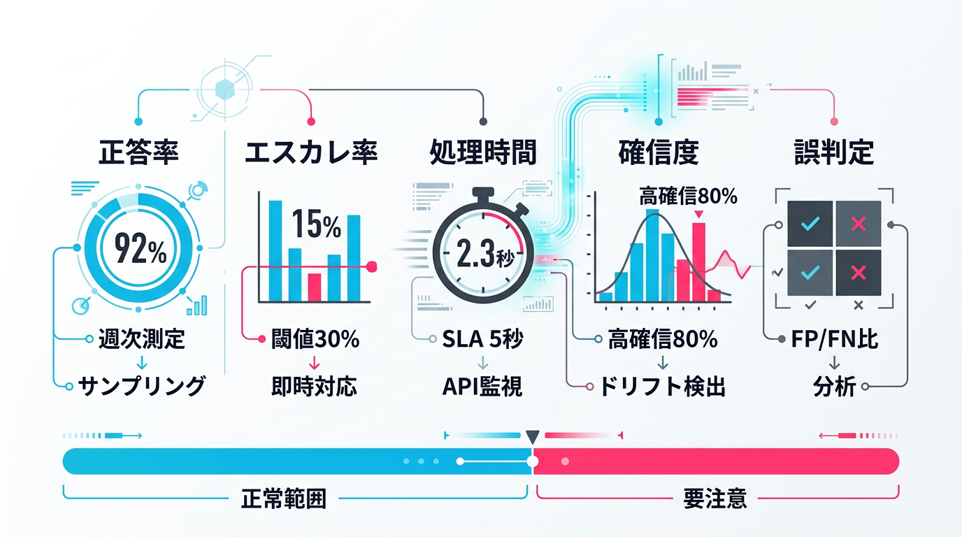 - 5つのKPIを設定する: 正答率、エスカレーション率、処理時間、確信度分布、誤判定パターン分布の5つを週次で追跡