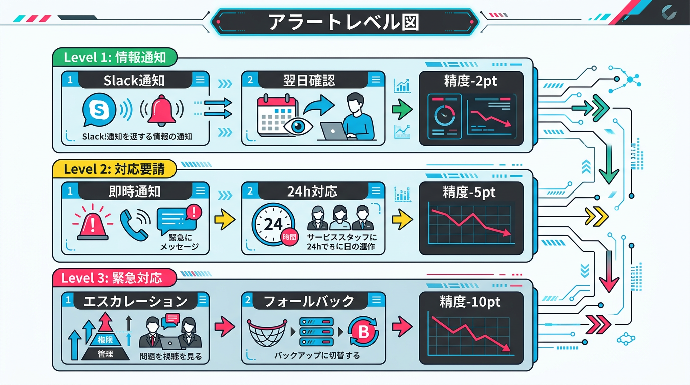 業務に影響が出始めている、または出る可能性が高いケース。正答率がベースラインから5ポイント以上低下、処理時間がSLAの80%に到達、特定カテゴリの誤判定が集中、といった閾値です。運用リーダーに即時通知し、24時間以内の原因分析と対策立案を要求します。