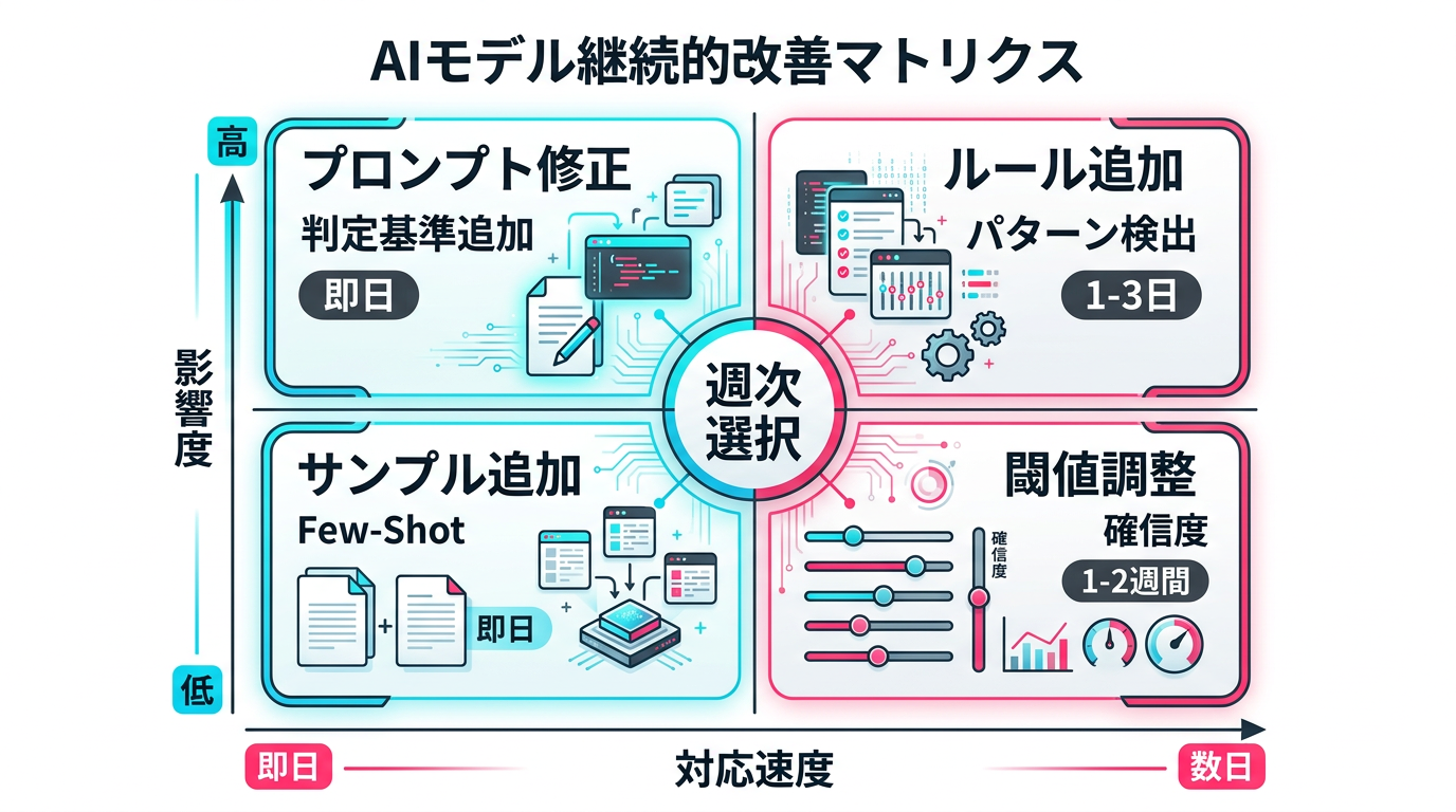 - プロンプト修正: 特定のカテゴリで誤判定が集中している場合、プロンプトにそのカテゴリの判定基準を追加・修正する。即日対応可能