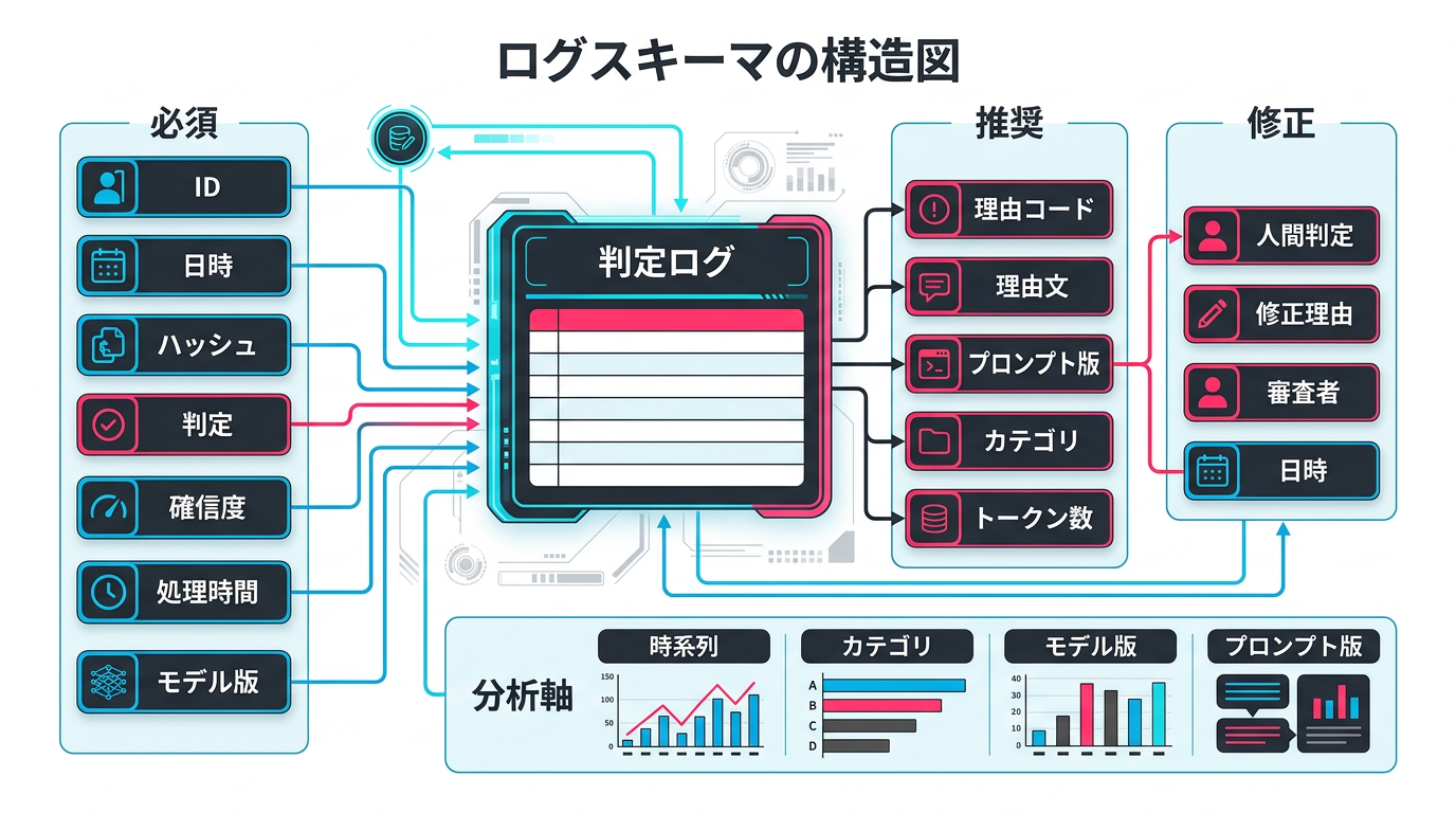 「判定結果を記録する」だけのログ設計では、後から分析しようとしても必要な情報が足りません。確信度スコアが記録されていない、NG理由がフリーテキストで統一されていない、プロンプトバージョンと紐づいていない。こうした設計不備が、ログ分析を困難にしています。