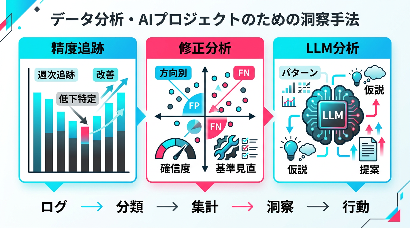 人間が数時間かけて行う誤判定のパターン分析を、LLMは数分で実行できます。ただし、LLMの分析結果は仮説として扱い、人間が検証した上で改善アクションに移すことが重要です。