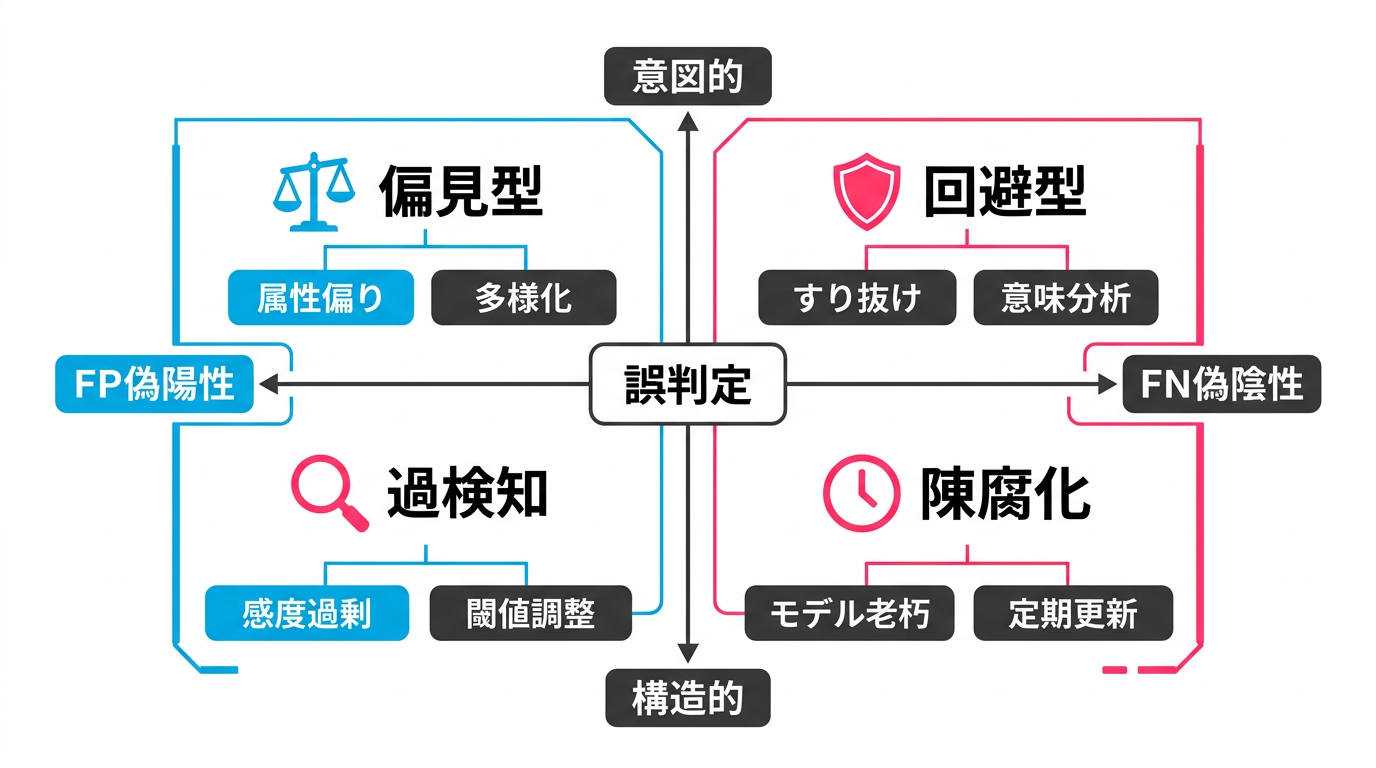 | 回避型 | FN | パラフレーズで検出回避 | セマンティック分析、ハイブリッド設計 |