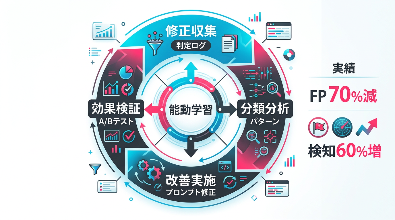 人間が修正した判定結果を教師データとして蓄積し、プロンプト改善やファインチューニングに活用するサイクルを回します。具体的には、修正ログの収集→NG理由の分類→パターン分析→プロンプト改善→精度検証の5ステップです。アクティブラーニングを組み合わせ、AIが最も不確実なケースを優先的に人間に提示すると、少ない修正データで効率的にモデルを改善できます。