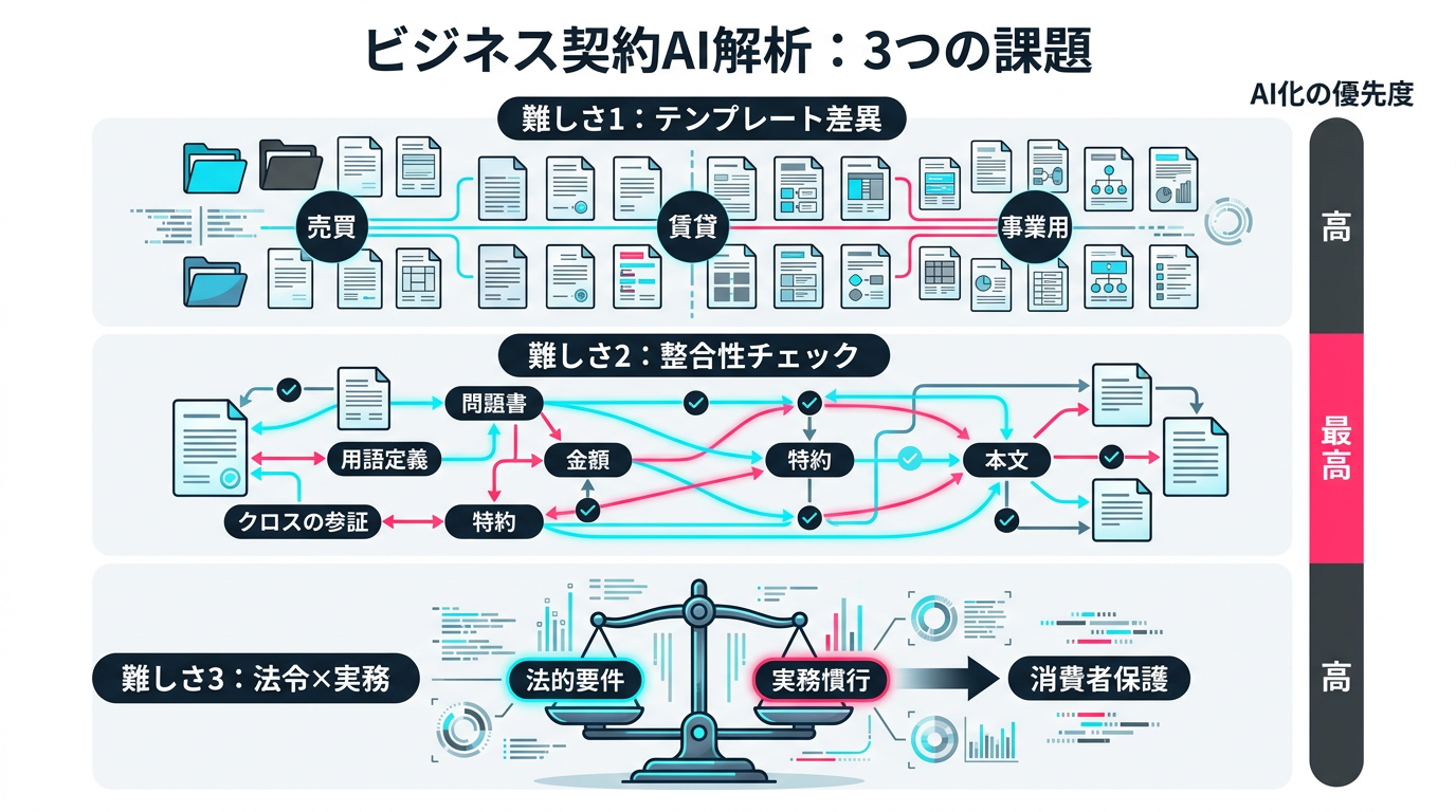 図1: 不動産契約書レビューの3つの固有課題