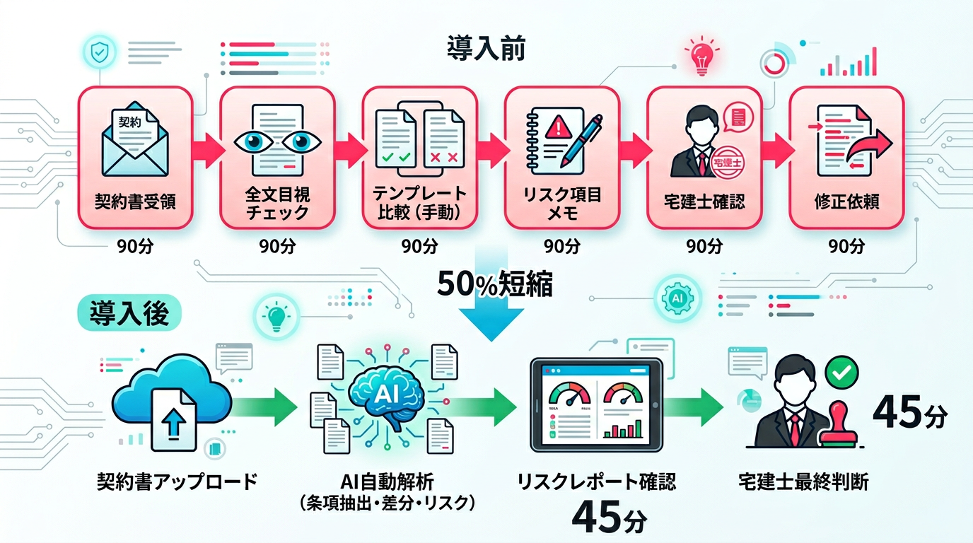 この記事では、中規模の不動産会社B社が重要事項説明書のAIリスクチェックを導入し、レビュー時間50%削減と見落とし事故ゼロを実現した事例を紹介します。
