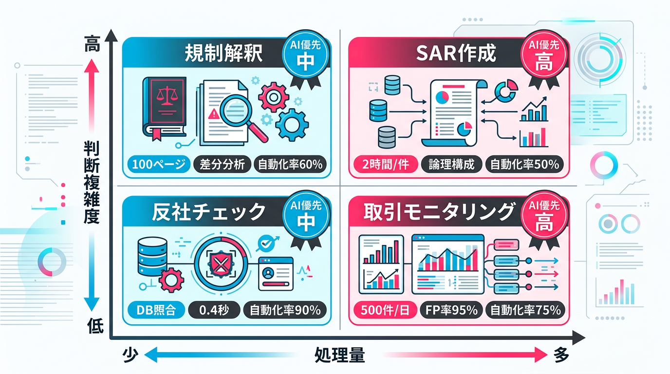 金融コンプライアンスの審査業務は大きく4つに分類されます。それぞれAI化の難易度と効果が異なります。