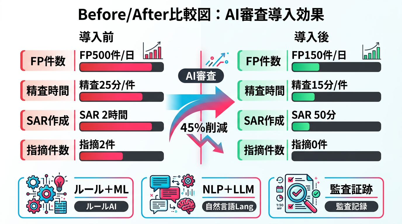 AIによるAML審査で偽陽性(FP)はどのくらい減らせますか?