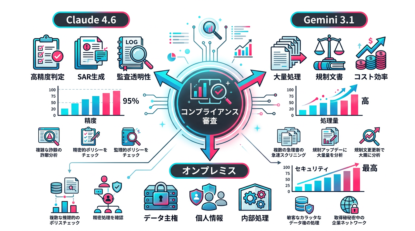 - Gemini 3.1 Pro: 大量の規制文書処理・ネガティブニュースの一次スクリーニングに使用。コスト効率に優れ、1Mトークンのコンテキストウィンドウで100ページ超の文書を一括処理